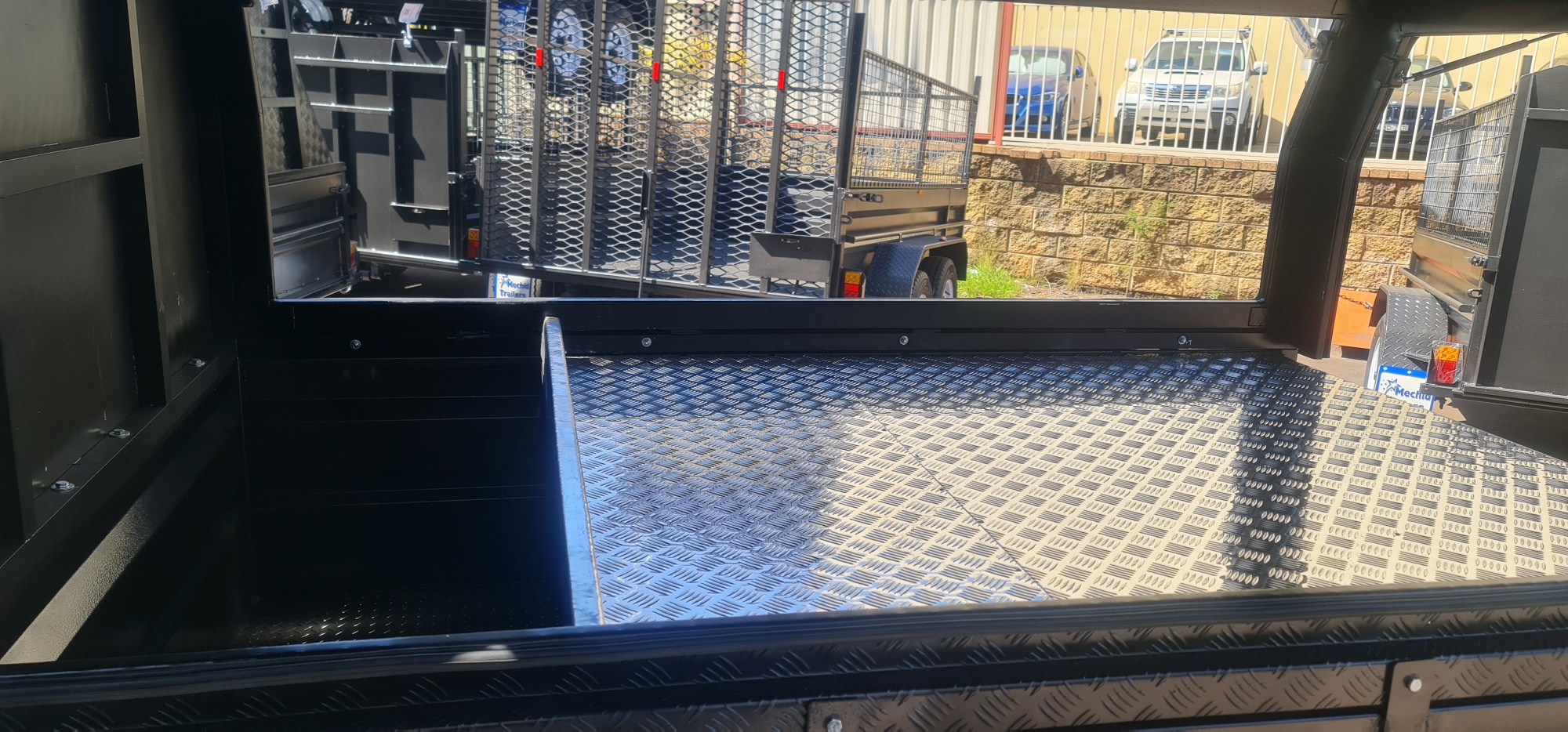 Partition in the meddle of trailer for tools and more storage underneath